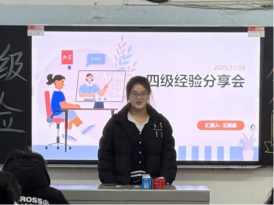 11月28日,外国语学院于弘道楼310教室开展大学英语四六级考试经验分享会。此次活动由2024级英语(师范类)一班史舒漫、2024级英语(师范类)二班王雨鑫主讲,2024级、2025级部分同学参加。