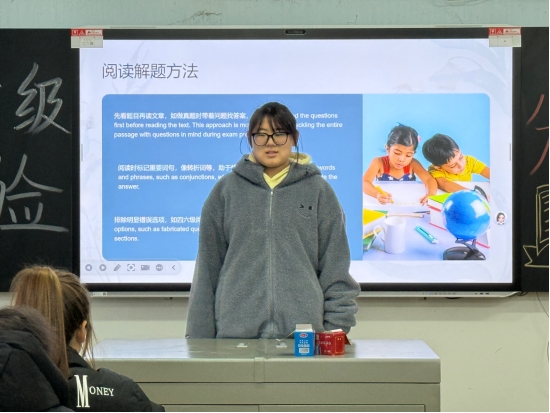 在阅读理解专项环节,史舒漫和王雨鑫聚焦选词填空、长篇阅读、仔细阅读三大题型,拆解不同题型的解题逻辑。她们现场选取了2025年6月四级阅读理解真题,组织同学们分组实战演练,她们针对共性问题集中答疑,详细讲解了长难句分析、同义替换识别等高分关键技能。