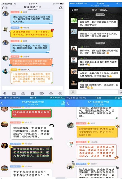 秉承认真学、带着感情学、带着责任学的原则,各班级班长、团支书将学习贯彻落实习近平总书记重要回信精神与学习宣传贯彻党的十九大精神结合起来,在习近平新时代中国特色社会主义思想指导下,采取集中学习、组织分组学习,网络读回信+谈感悟交流学习,引起各班同学在微信或QQ平台的热议,使线上线下学习活动相辅相成,入心入脑。所有同学积极参加讨论,分享学习体会及心得。