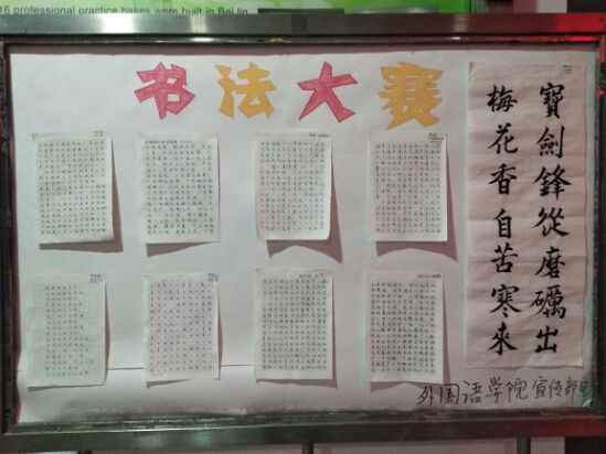 比赛中,同学们个个精神专注,凝神运气,纵横挥洒,书写个性鲜明,展现出自己最高的水平。笔墨飞舞间,一幅幅或清新飘逸或苍劲有力的作品展现在眼前。赛后,大家互相观摩,互相探讨笔法、布局等技巧,体现了同学们谦虚好学的精神风貌。活动成果照片在外语楼展板展示。