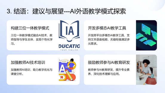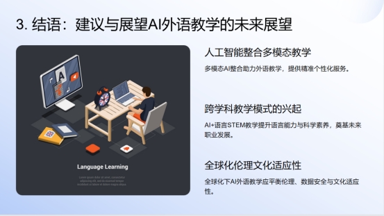 贾院长提出,教育数字化背景下,外语教学面临资源不均、个性化缺失等挑战,而AI技术为变革带来契机。国外AI外语教学起步早,已构建智能辅导等技术体系;国内也在本土化探索,如AI评测系统融入中高考。AI通过智能教学系统、虚拟语言伙伴等模式推动教学创新,提升效率与质量,助力教育公平。