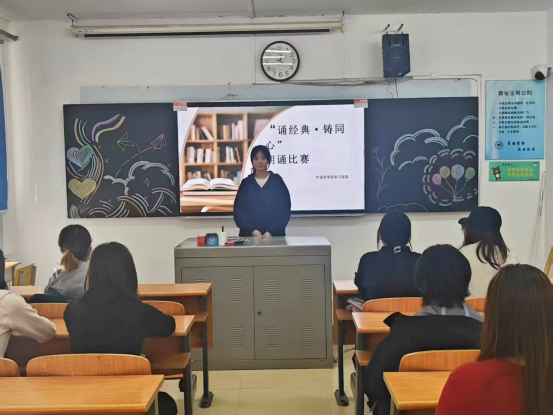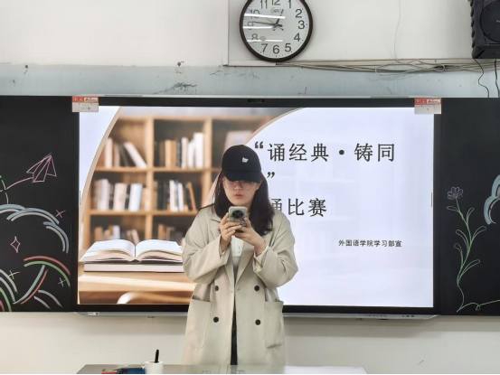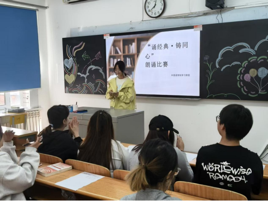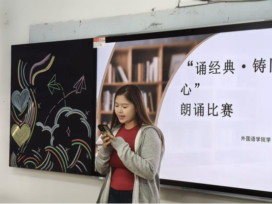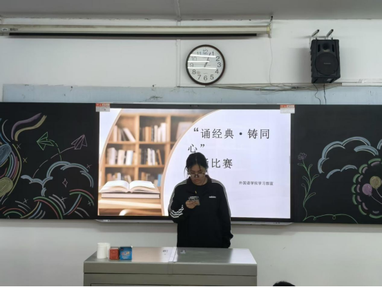 9月19日,外国语学院于弘道楼310教室举办以“诵经典·铸同心”为主题的朗诵比赛。本次活动由学习部副部长赵启娇主持,各级学生积极参加。