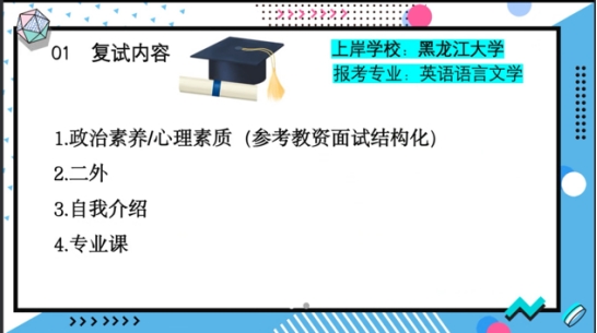 王馨苑紧扣为同学做实事,促进同学就业发展的核心导向,围绕黑龙江大学英语语言文学专业考研复试展开讲解,共包含复试内容、备考方法及注意事项等三方面内容。