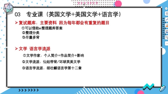 王馨苑鼓励同学们在专业课上探索适宜的方式,可以对历年真题中的重复题目进行重点标注、分类整合,做到查漏补缺,并以专业课知识框架为依托,逐一梳理文学领域的重点作家与流派等理论内容,完备知识体系。