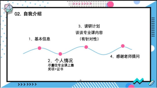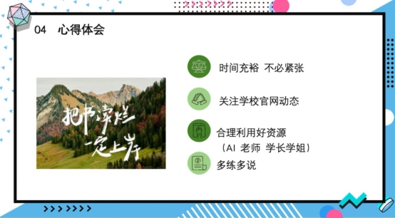 分享会中,同学们不仅清晰理解并掌握了复试的具体要求,还系统学习了自我介绍的撰写要点,明确要在该环节做到针对性强、亮点突出,展现个人学术规划,进一步推进复试中与老师的交流。