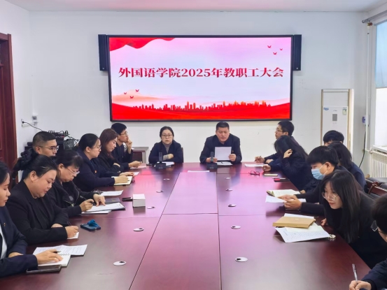 2025年12月31日,外国语学院于弘道楼306会议室召开2025年度教职工大会。此次会议由外国语学院工会主席王奕丽主持,学院全体教职工参加会议。